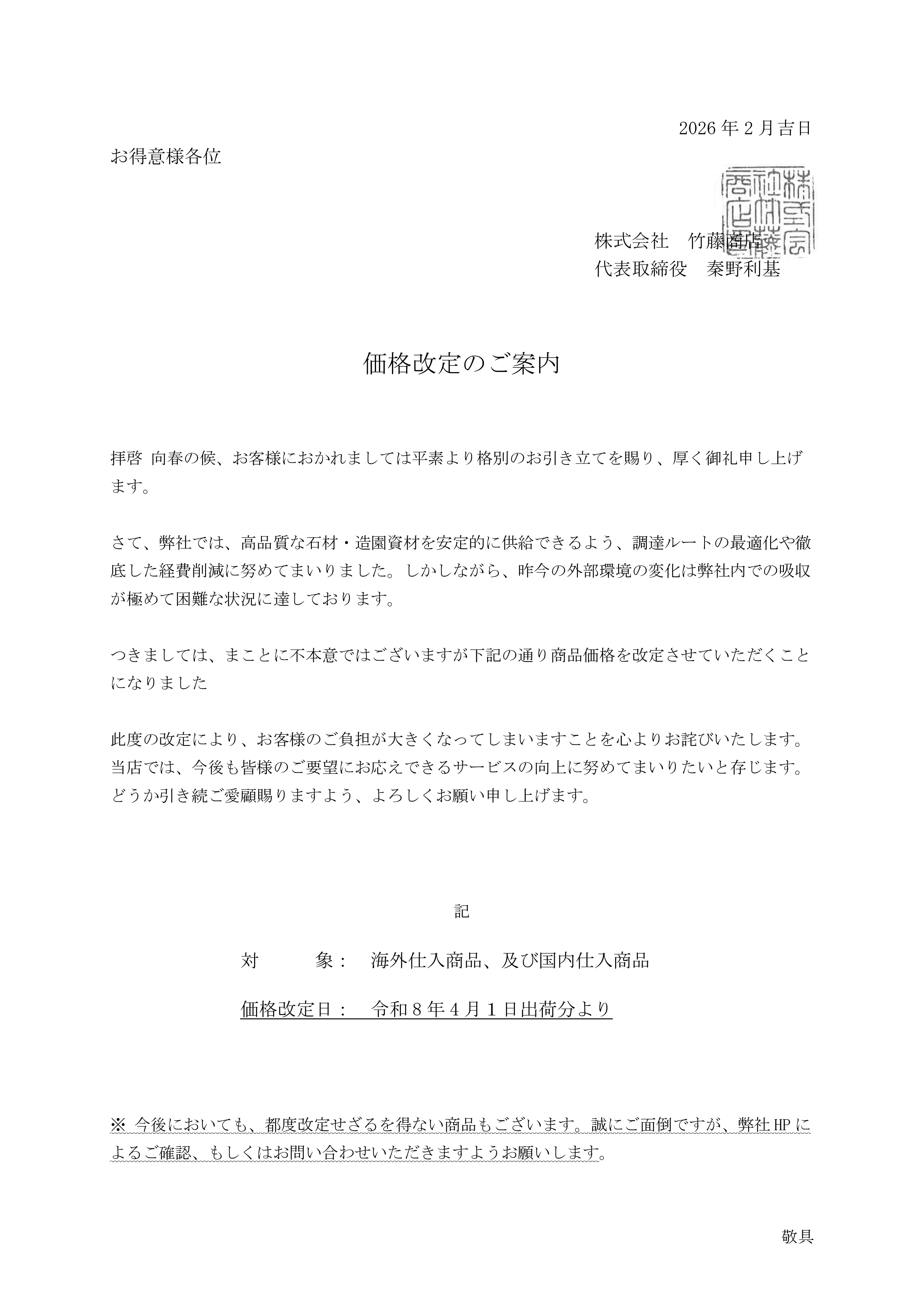 価格改定のお知らせ